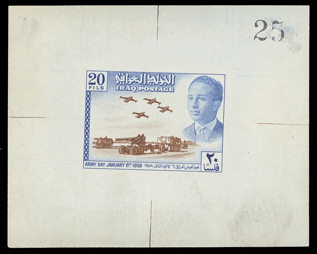 20f. brown and blue, die proof of the completed design on gummed paper (70x57mm.), numbered "25"; a trifle soiled, fine and scarce. Photo