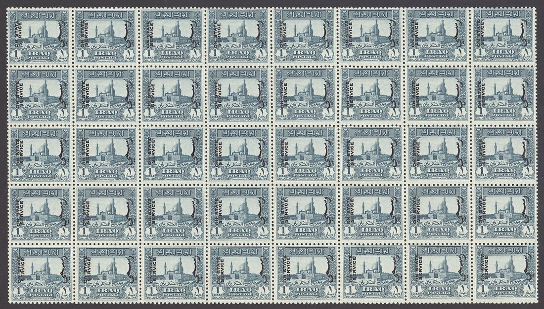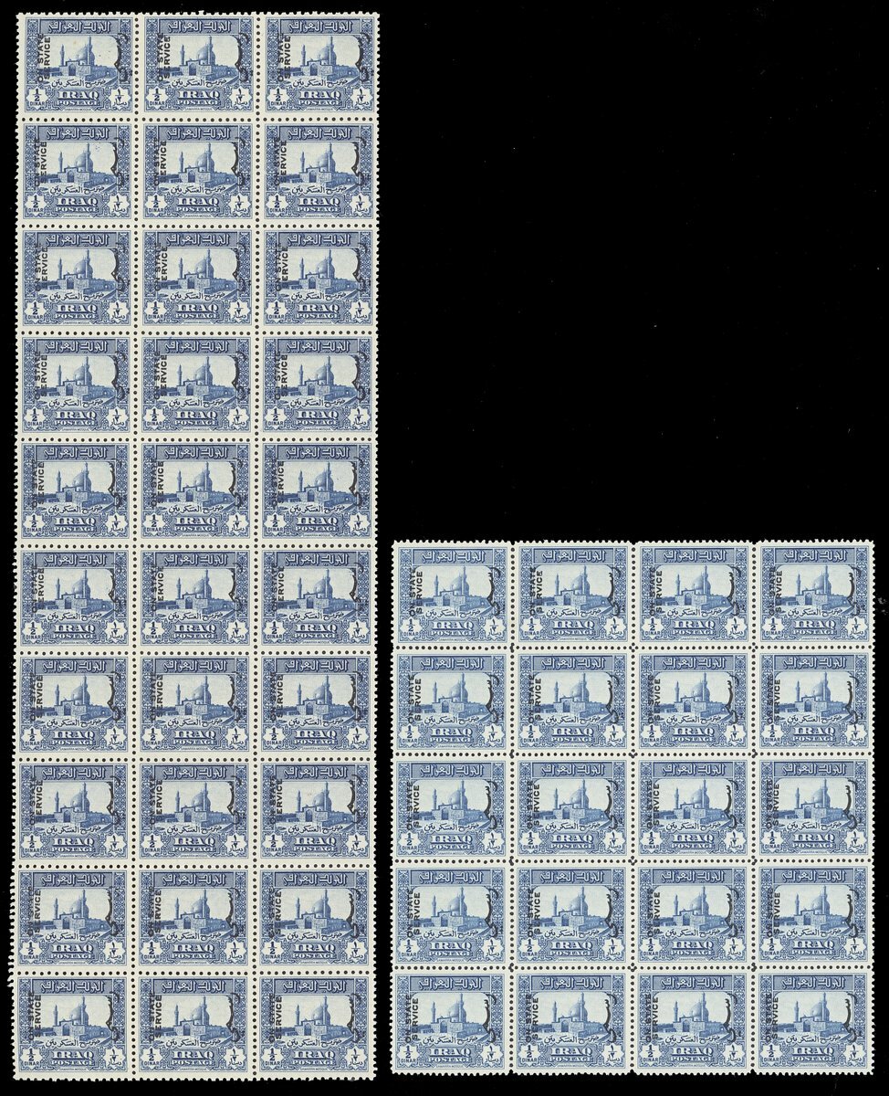 1941-43 ½d. blue perf. 11½x13 block of thirty (3x10), ½d. bright blue perf. 14x14 block of twenty (4x5) and 1d. turquoise-green block of fourty (8x5), all unmounted mint; one or two tiny oil or tone spots mentioned only for the sake of accuracy. S.G. O253, O254, c.£2,000++