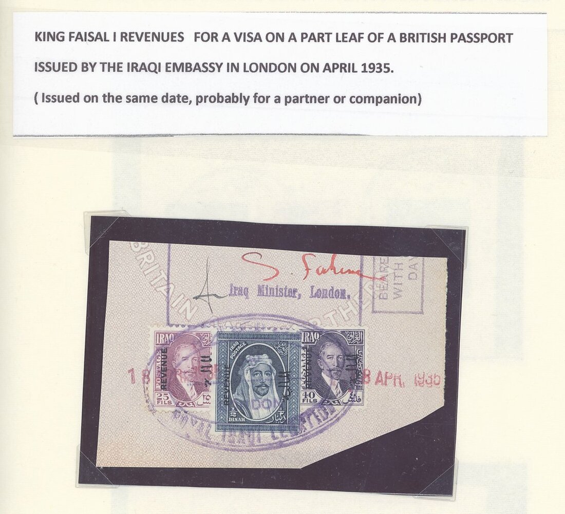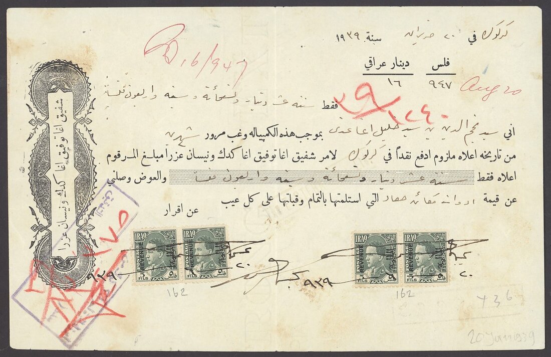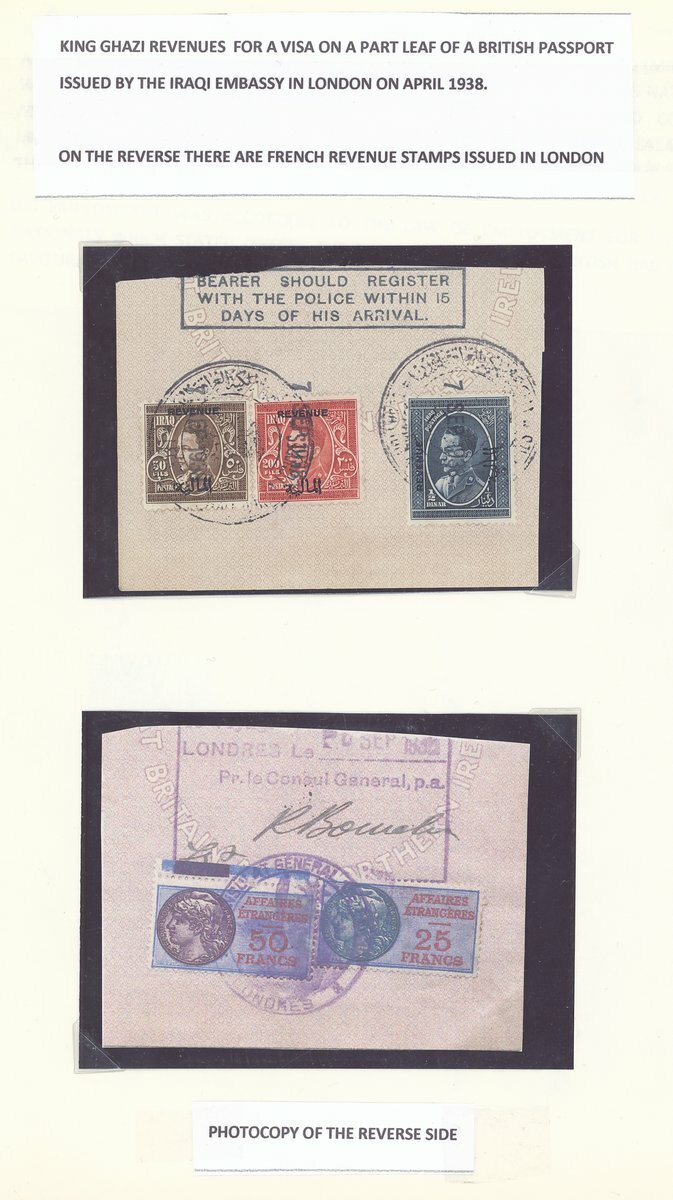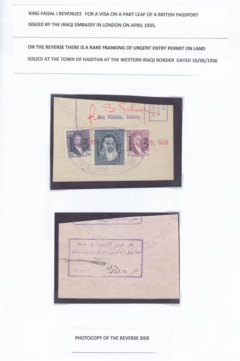 A collection in a binder of revenue documents (12) and pieces (3) including travel documents, cheques, invoices, grievances on dismissal, employments, building warrants and other Ottoman and Hedjaz Railway documents. Of the pieces, one has scarce Haditha town marking, another as part of a British passport, also of note a 1954 document signed by the Iraqi Deputy Finance Minister (Mr. Amin Abdulkarim) confirming the extension of a Dutch National's contract at the Central Water and Council Municipality with a wage of 175 Dinars. Others with stamps tied by seal and or thumb print. A nice group