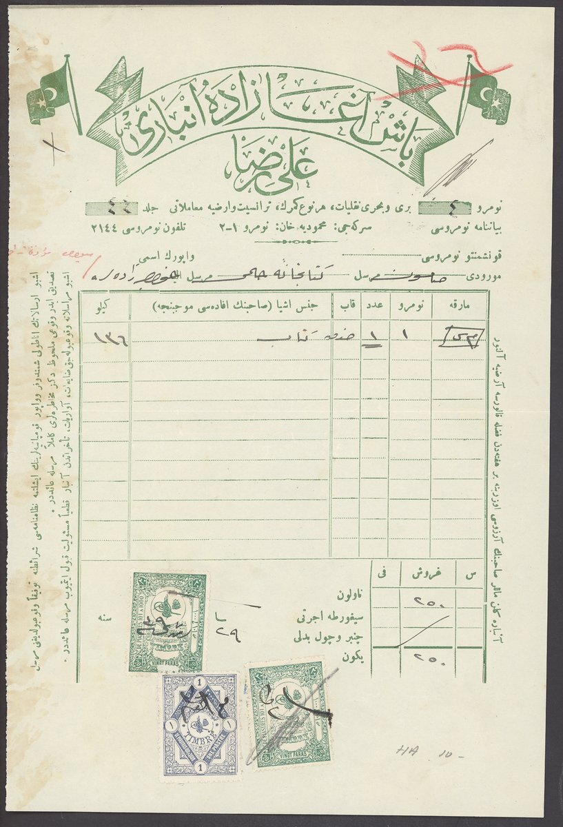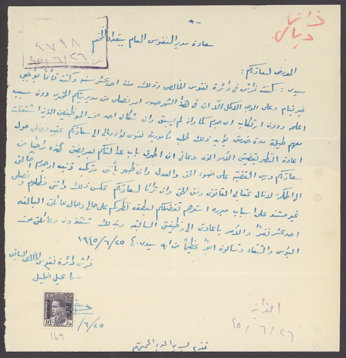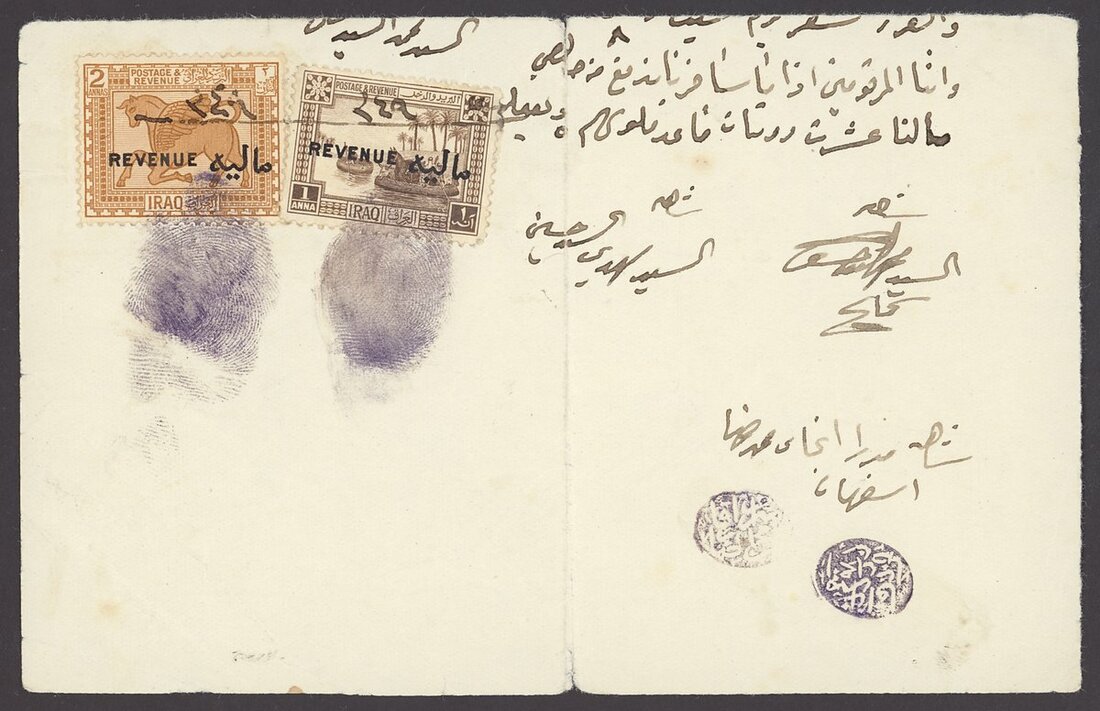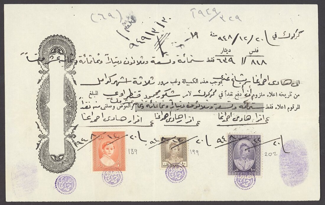 A collection in a binder of revenue documents (12) and pieces (3) including travel documents, cheques, invoices, grievances on dismissal, employments, building warrants and other Ottoman and Hedjaz Railway documents. Of the pieces, one has scarce Haditha town marking, another as part of a British passport, also of note a 1954 document signed by the Iraqi Deputy Finance Minister (Mr. Amin Abdulkarim) confirming the extension of a Dutch National's contract at the Central Water and Council Municipality with a wage of 175 Dinars. Others with stamps tied by seal and or thumb print. A nice group