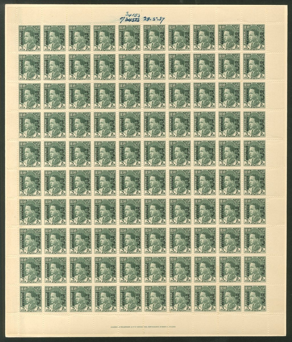 1937 5f. grey-green imprimatur complete sheet of one-hundred mounted on carton paper and with printer's manuscript '34153 28.5.37' in ink. Fine. Ex. Bradbury, Wilkins Archive