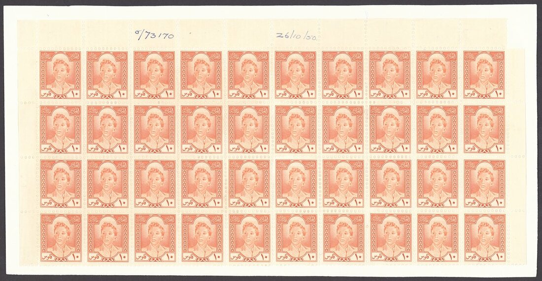 1950 10f. red-orange without surcharge imprimatur block of forty (10x4), mounted on carton paper - though an attempt at removal has been made leaving a couple of stamps thinned - with printer's manuscript '0/73170' and '26/10/50' in ink. Scarce. Ex. Bradbury, Wilkins Archive