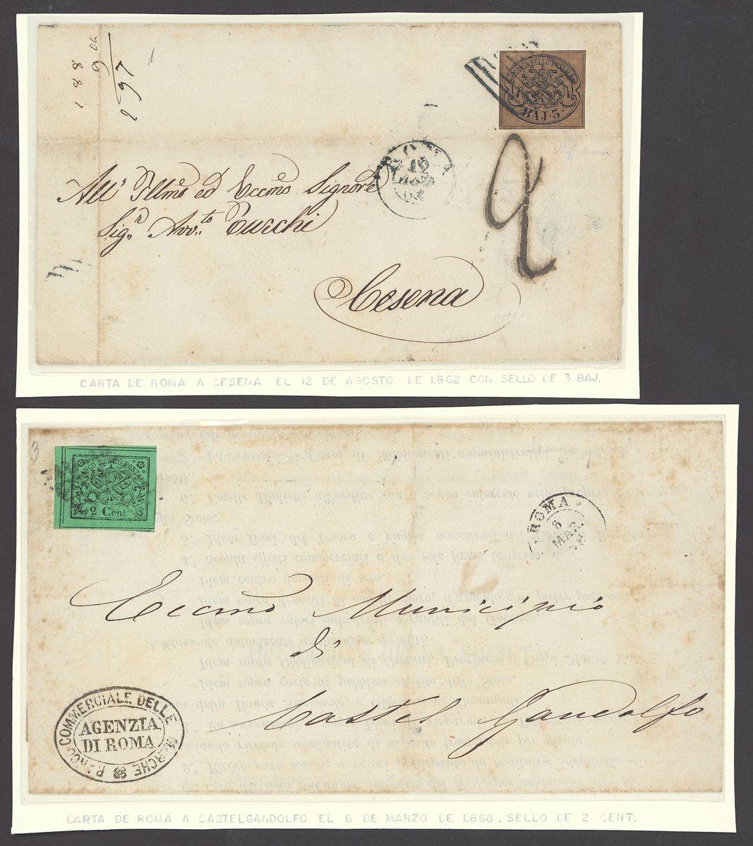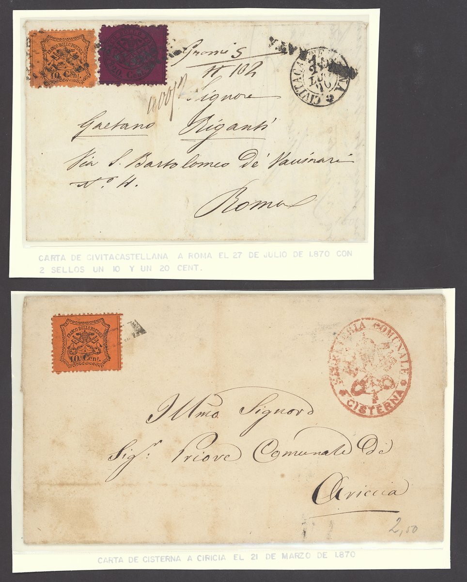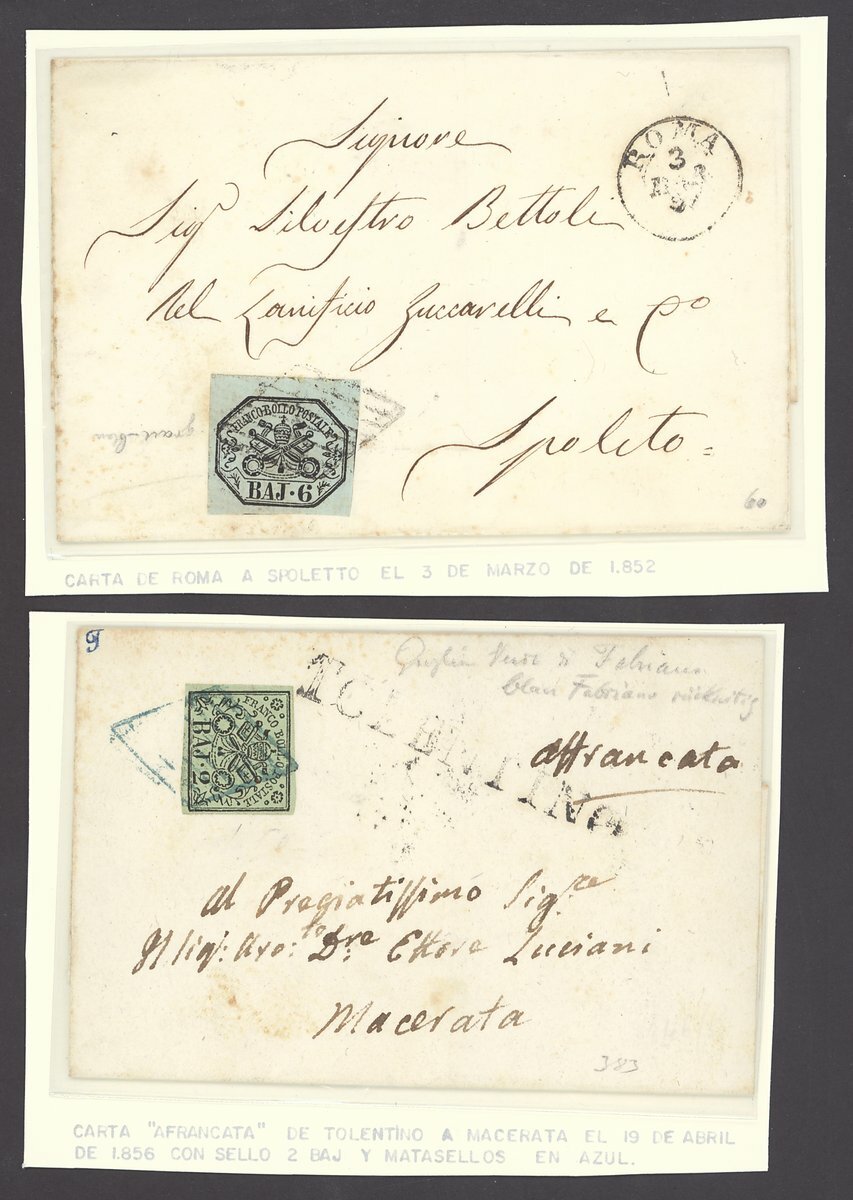 1852-68 Papal States selection of seven entires, including 1852 from Rome to Spoletto franked 6b., 1856 to Macareta franked 2b. with blue lozenge cancellation, 1868 to Castel Gandolfo franked glazed paper imperf. 2c., 1868 to Livorno franked perf. 20c., l870 from Civitacastallana to Rome franked perf. 10c., 20c., etc., mixed condition
