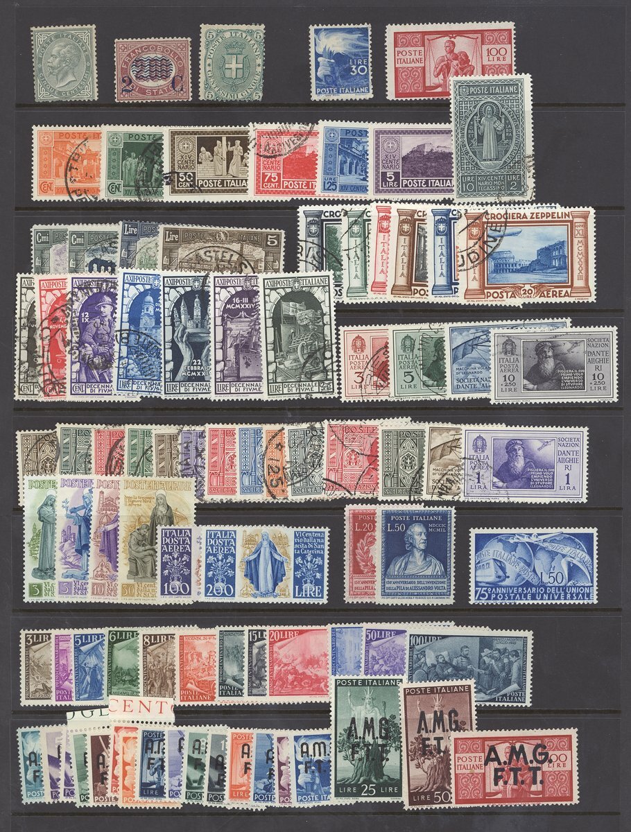 Mint and used selection (85) on stockpages, including 1863-65 5c. 1878 2c. on 2L., 1891-97 5c., 1929 Monte Casino set (used), 1930 National Defence (used), 1933 Zeppelin set (used), 1944-48 30L. and 100L., 1948 St. Katherine Postage and Air, 1948 Risorgimento 3L. to 100L., 1949 U.P.U. 50L., 1949 Volta set, Trieste 1947-48 set, etc.; mixed condition though many fine and unmounted mint