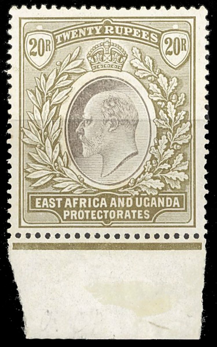 1904-07 20r. grey and stone, marginal from the foot of the sheet, large part original gum with minor areas of toning that scarcely detract from the appearance. S.G. 32, £850
