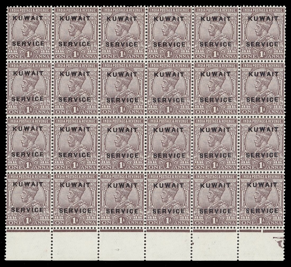 1923-24 1a. chocolate block of twenty-four (6x4) from the foot of the sheet, variety overprint double, one albino, unmounted mint; superb and rare. S.G. O2a, £3,360+.