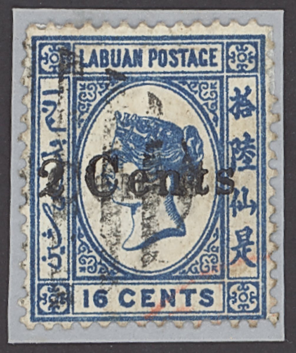 1885 (July) "2 Cents" on 16c. blue, variety surcharge double, fine used on fragment. Very rare. R.P.S. Certificate (1920). S.G. 25a, £7,000