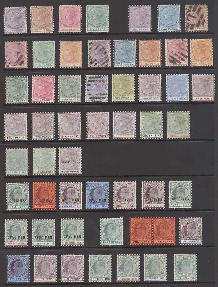 1874-1906 mint and used group on a Hagner page including 1874 CC 1d., 3d. 4d. and 6d. unused, 1876-79 CC perf. 14 to 1/- mainly (3d. and 4d. used), 1884-86 CA with values to 1/- mainly mint, 1887-1902 CA to 10/- unused (7½d. used), 1893 ½d. on 4d. with surcharge double, 1904 CA set to 10/- overprinted