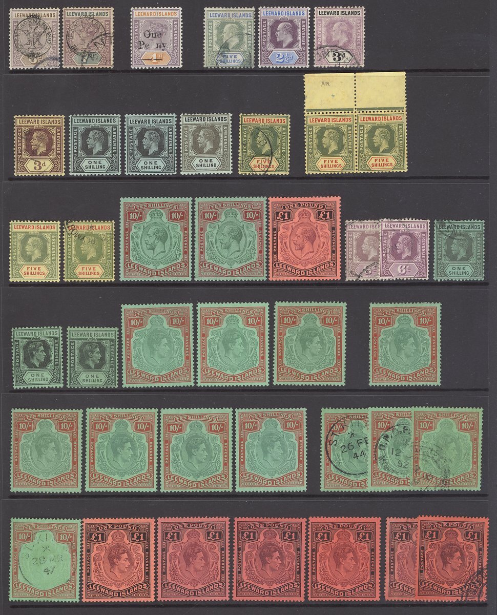 1897-1938 with 1897 6d. and 7d. used (doubtful cancels), 1902 1d. on 4d. with first 'n' of 'penny' partially omitted, 1902 5/- used, 1907 5/- marginal pair and used single, 1921 10/- (2, unused), £1 mint, 1938-51 10/- mint (8, shades), used (4), £1 both shades mint (two of each) and used (one of each). Mixed condition. Cat. c.£3,300+