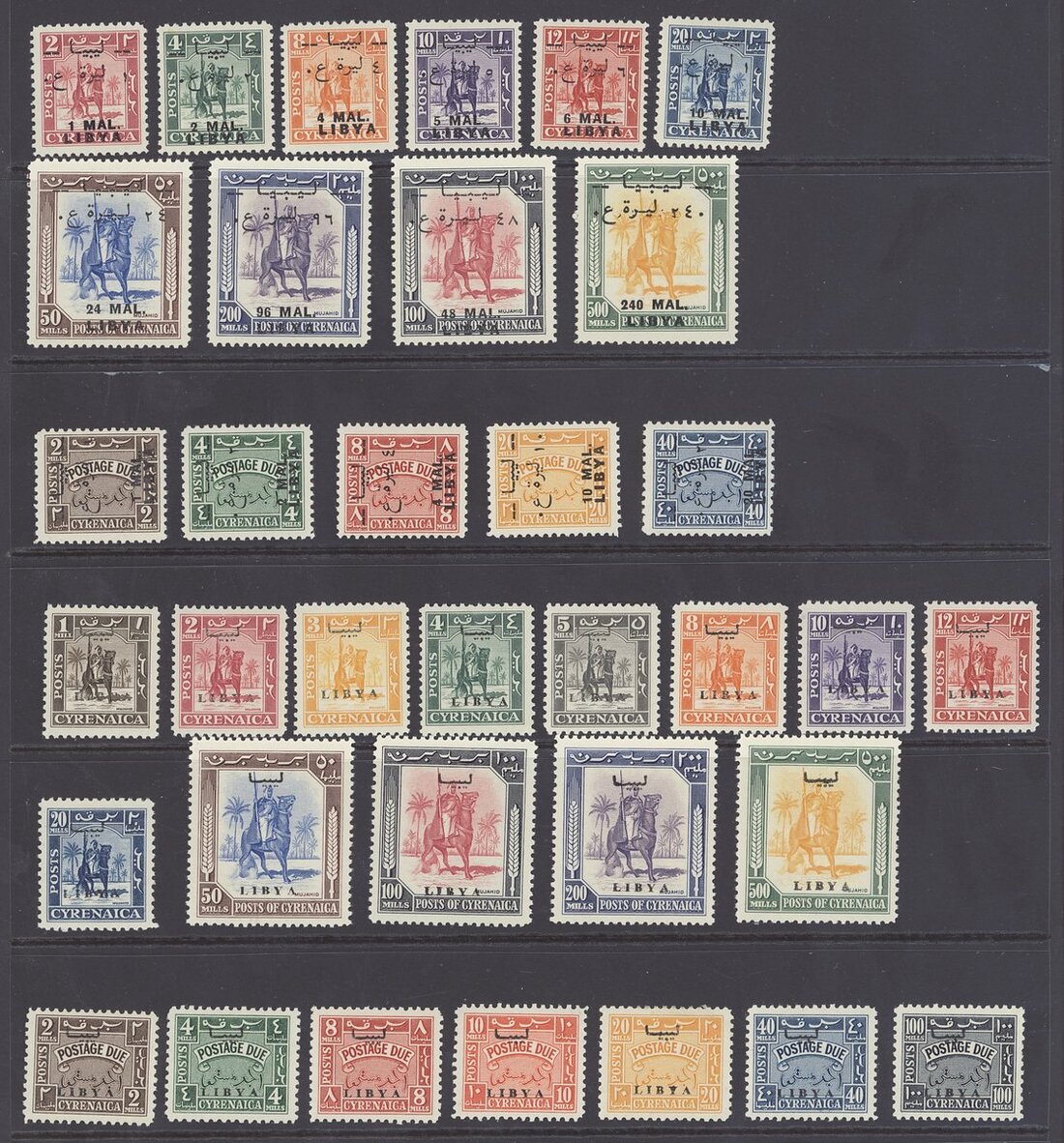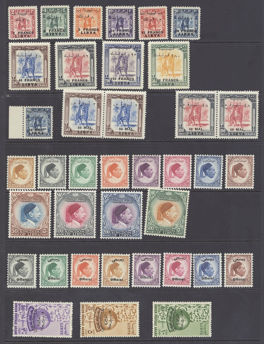 Selection (73) on stockpage, including Tripolitania 1951 Horseman (2 sets), Fezzan and Cyrenaica "20" for "10" error, 25L. on 50m. and 48L. on 100m. broken Arabic "t" variety, 1952 King Idris set, 1955 U.P.U. set with inverted overprints, Officials, Postage Dues, etc., unmounted mint, fine
