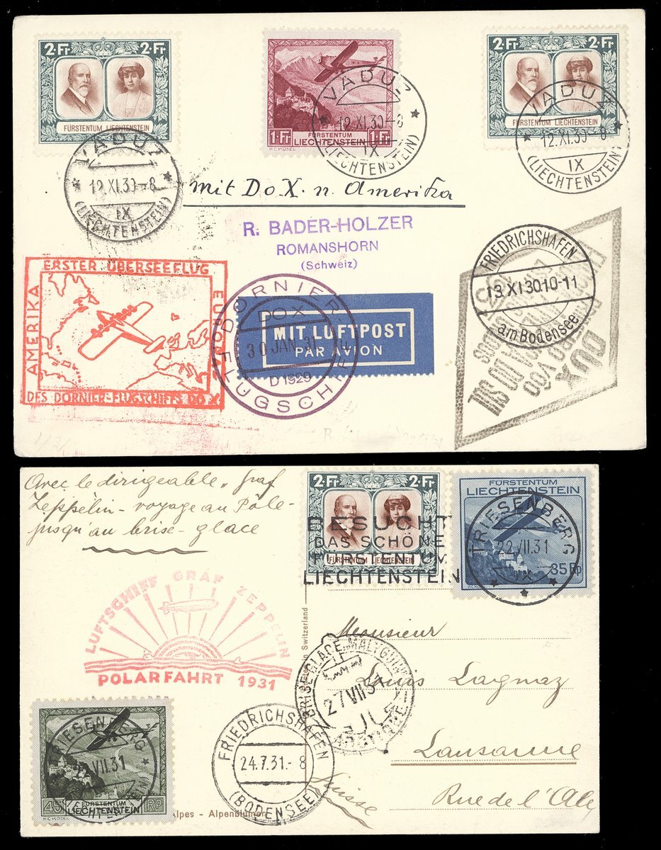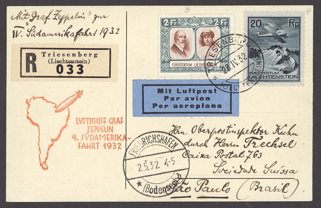 1930 (12 Sept.) "DO-X" flight card to Switzerland bearing Pictorial 2f. (2), Air 1f., 1931 (22 July) Zeppelin Polar flight card to Switzerland bearing Pictorial 2f., Air 35r., 45r., 1932 (28 April) 4th. Zeppelin South America flight card registered to Sao Paulo bearing Pictorial 2f., Air 20r., special flight cachets, fine