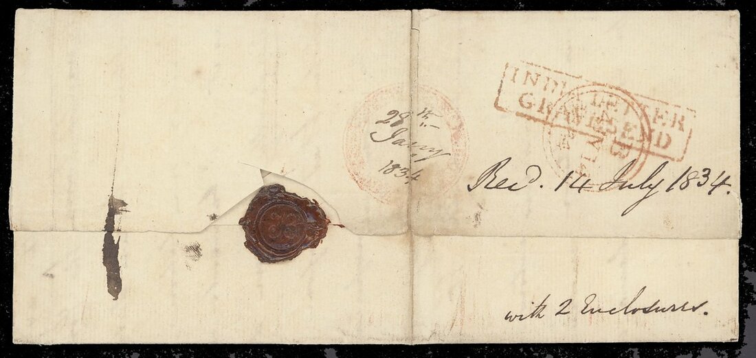 1834 (28 Jan.) entire letter to London, marked "1¼oz", rated "2/10" and showing, on reverse, a readable example of circular intaglio