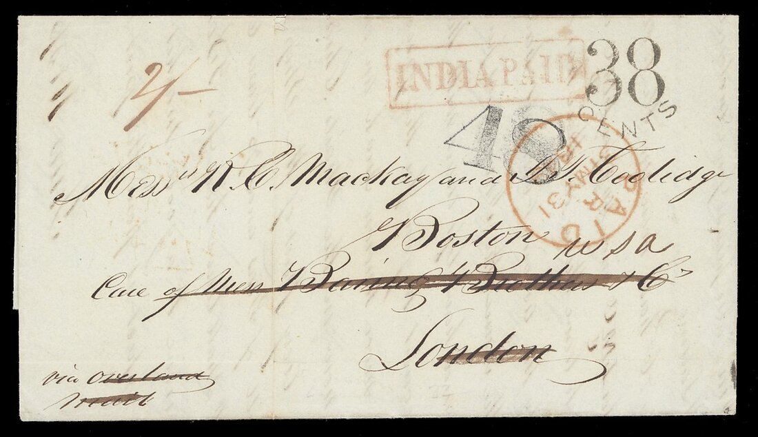 1849 (3 Apr.) entire letter to Boston USA c/o Baring Brothers in London, rated "2/-" and showing, on reverse, a light but legible strike of the very scarce framed