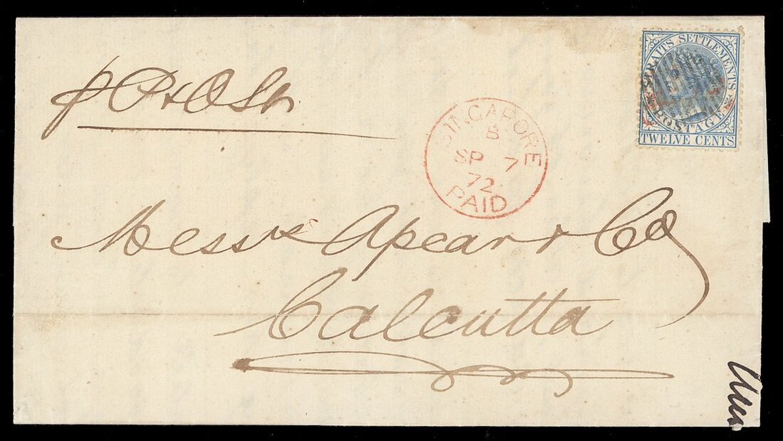 1872 (7 Sept.) entire letter from Singapore to Calcutta, bearing 1867-72 12c. blue cancelled by red firm's chop and small circle of bars, showing