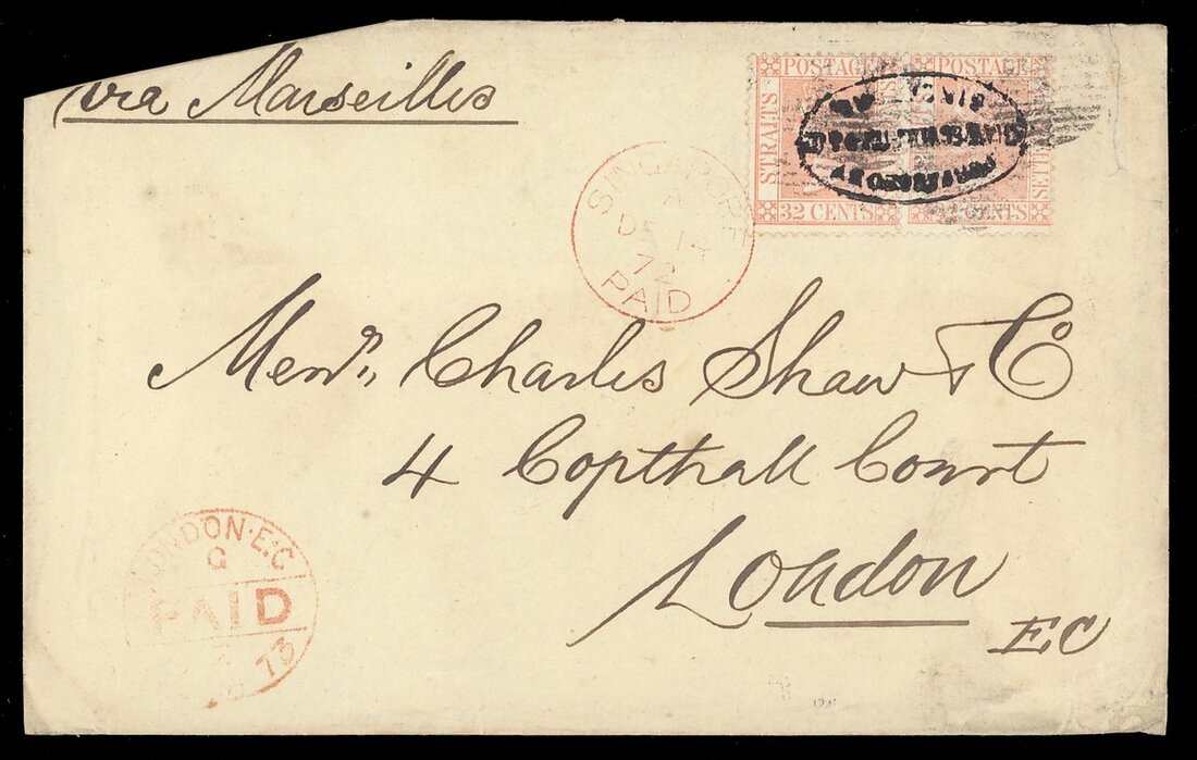 1872 (14 Dec.) double rate envelope from Singapore to London, marked "Via Marseilles", bearing 1867-72 32c. pale red pair with central firm's chop and tied by small circle of bars, showing