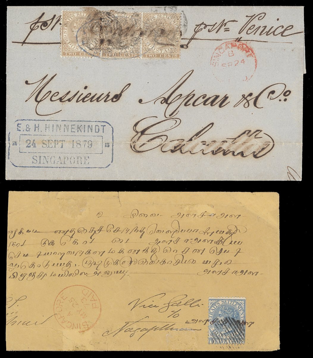 1873 (25 May) envelope (small faults) from Singapore to Nagapatam, marked "Via Galle", bearing 1867-72 12c. blue (straight-edge at right) tied by manuscript marking and small circle of bars and showing