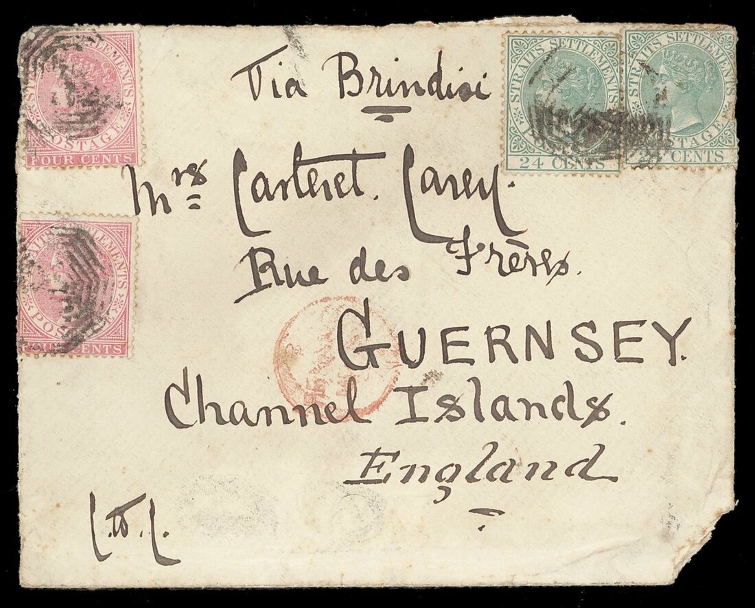 1877 envelope from Singapore to Guernsey, marked "Via Brindisi", bearing 1867-72 4c. rose (2) and 24c. blue-green (2), all with faults, cancelled by smudgy "B/172" cancels and showing arrival datestamp (24.4) on reverse; the envelope with piece from lower right corner and flap missing