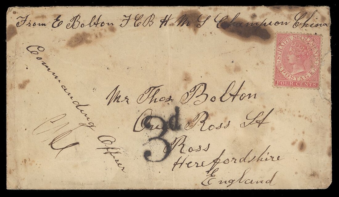 1883 sailor's envelope to England, headed "From E. Bolton FCB H.M.S. Champion China", countersigned by Commanding Officer, bearing uncancelled 2c. rose and showing handstruck "3d" with arrival datestamp on reverse; the envelope stained, some creases and roughly opened at right, but rare