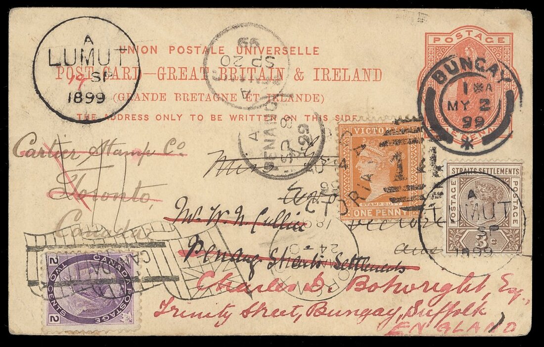 1899 (2 May) GB 1d. stationery card from Bungay to Avoca, Victoria, re-addressed to Penang and bearing Victoria 1d. tied by "14" duplex, re-addressed again to Penang and showing arrival c.d.s. (9.9), re-addressed to Toronto and bearing 3c. tied by