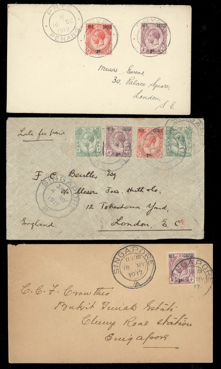 1917 (May) Red Cross 3c. + 2c. and 4c. + 2c. used with 1c. (2) on 1917 (4 May) envelope (creases) from Singapore to London, 3c. + 2c. and 4c. + 2c. on 1919 (16 Sept.) Ewens envelope to London, both tied by