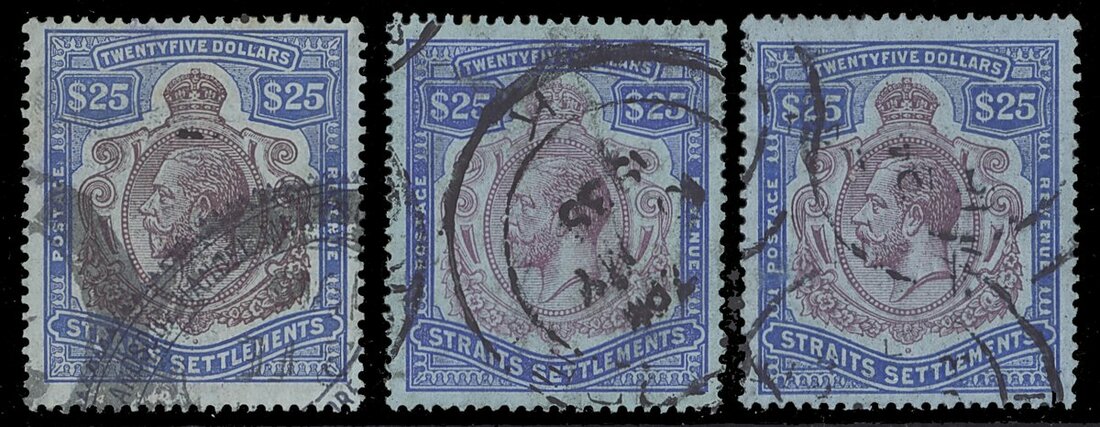 1921-33 Script $25 purple and blue on blue (2), both with Singapore datestamps, fine; also 1912-23 $25 fiscally cancelled. S.G. 240b, £400