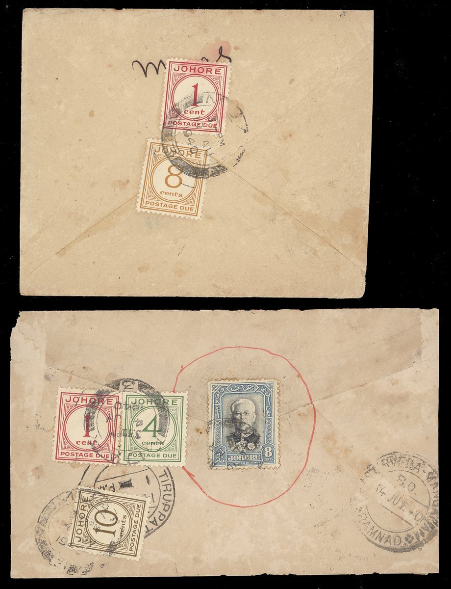 1940 (2 July) India 1a. stationery envelope to Muar bearing, on reverse, Postage Due 1c. (red ink stain at top) and 8c. applied and cancelled on arrival (10.8); and re-used? envelope (faults) back from India to Muar bearing Postage Due 1c., 4c. and 10c., all cancelled on arrival (4.7)
