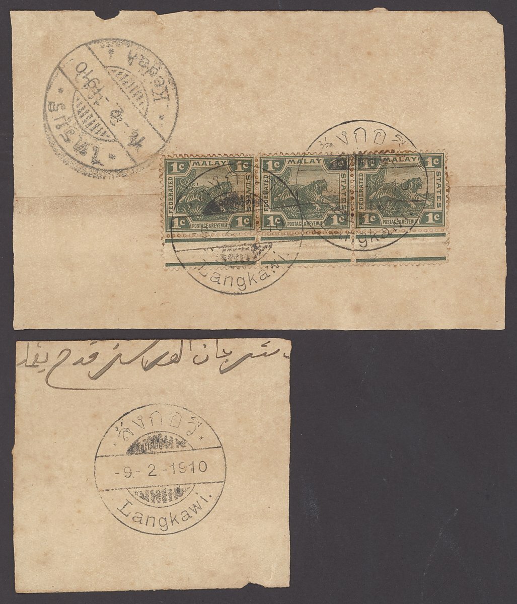 1910 (6 Feb.) envelope back bearing FMS 1c. strip of three (some staining) clearly tied by bi-lingual "Langkawi" c.d.s. and showing bi-lingual "Kedah" c.d.s. alongside; also piece with fine strike of bi-lingual "Langkawi" c.d.s. Rare