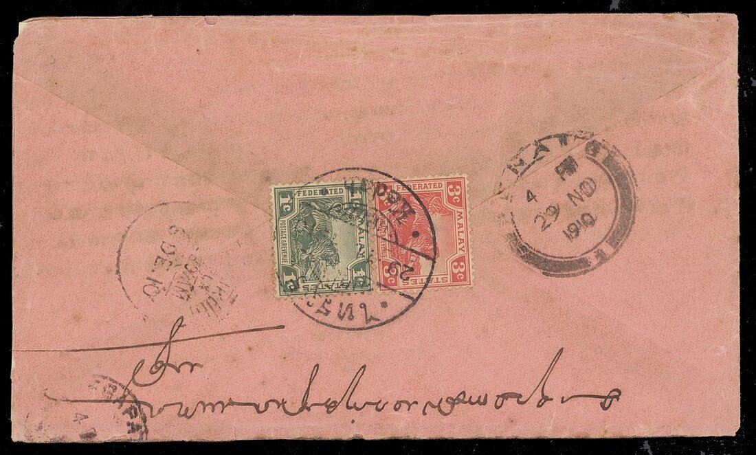 1910 (29 Nov.) envelope (faults) to India bearing, on reverse, FMS 1c. and 3c. tied by bi-lingual "Kedah" c.d.s. and showing Penang and arrival datestamps alongside