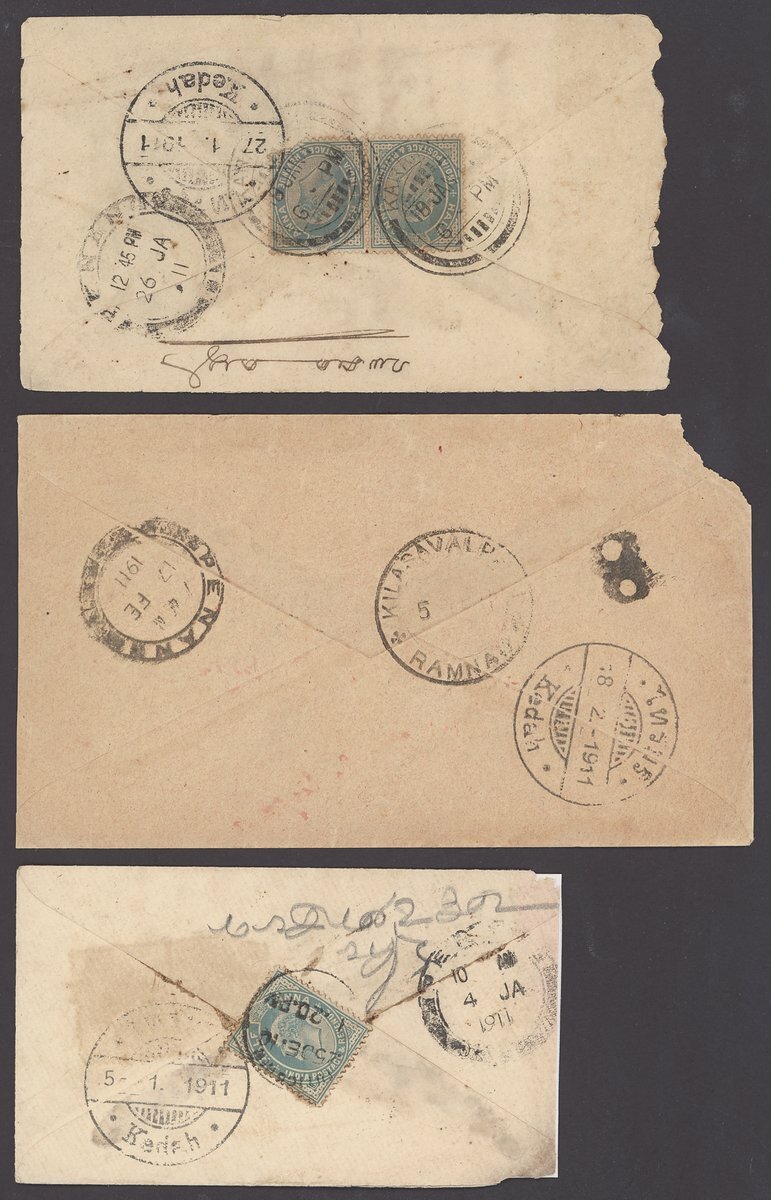 1910 (25 Dec.) and 1911 (18 Jan.) envelopes from India to Kedah franked at ½a. and 1a. respectively, both showing bi-lingual "Kedah" arrival datestamp (5.1 and 27.1); 1911 (5 Jan.) unstamped envelope from India to Kedah showing, on reverse, bi-lingual "Kedah" arrival datestamp and handstruck "8" tax marking