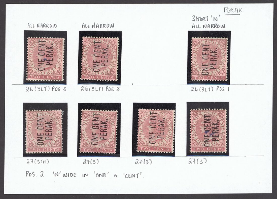1886 1c. on 2c. pale rose with Types 23 (3) and 24 (4), all unused with part or large part original gum, one Type 42 with small corner thin and another with some blue ink marks on face. S.G. 26-27, £760