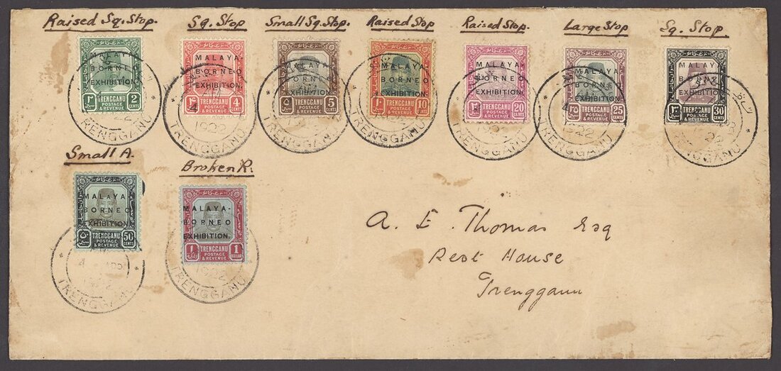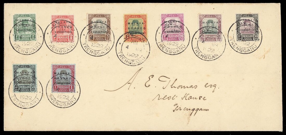 1922 Exhibition 2c. with raised stop, 4c., 5c., 10c., 20c., 25c. with raised stop, 50c. and $1 on 1922 (4 Mar.) locally addressed envelope, and 2c. with raised stop, 4c., 5c., 10c. with raised stop, 20c. with raised stop, 25c., 30c., 50c. with small