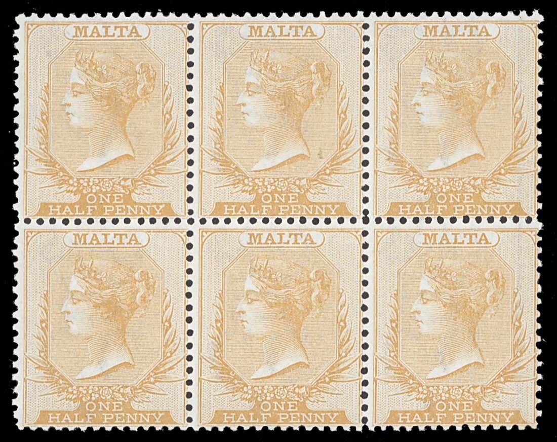 1863-81 CC ½d. yellow-buff block of six (3x2), fresh mint with four stamps remaining unmounted mint. S.G. 10, £510+