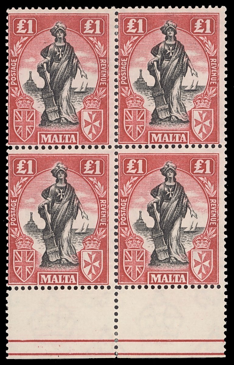 1922-26 £1 black and carmine-red marginal block of four from the foot of the sheet, the top pair lightly mounted, the lower pair remaining unmounted. Attractive. S.G. 140, £440
