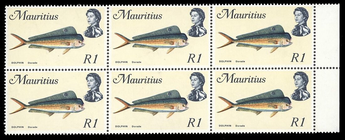 1971 1r. Dolphin on glazed paper marginal block of six (3x2), variety watermark inverted, fine unmounted mint. S.G. 396w, £570+