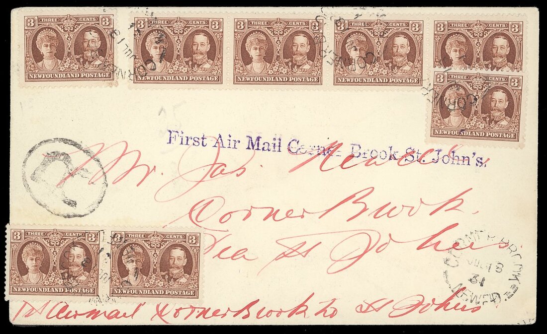 1931 (19 July) Corner Brook-St. John's flight envelope registered to St. John's, bearing 24c. cancelled by Corner Brook c.d.s., showing "R" in oval, straight-line "First Air Mail Corner Brook-St. John's" in violet and, on reverse, Registered St. John's double-ring d.s. in violet. Rare with very few covers carried
