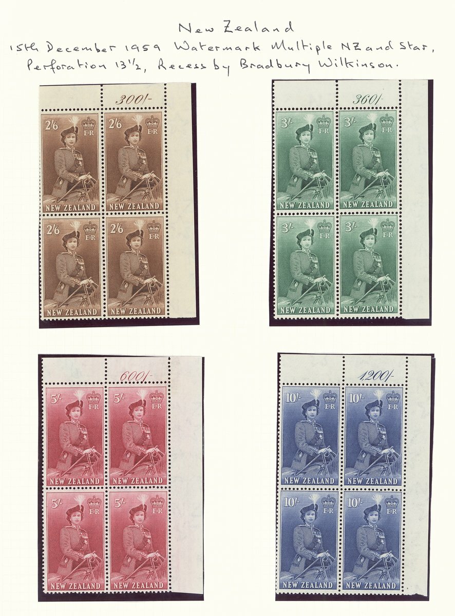 1953-59 2/6d. to 10/- in corner blocks of four with plate number, also 1947-52 set to 3/- and 1955-59 set to 8d.; fine unmounted mint. S.G. 733d-736, etc.