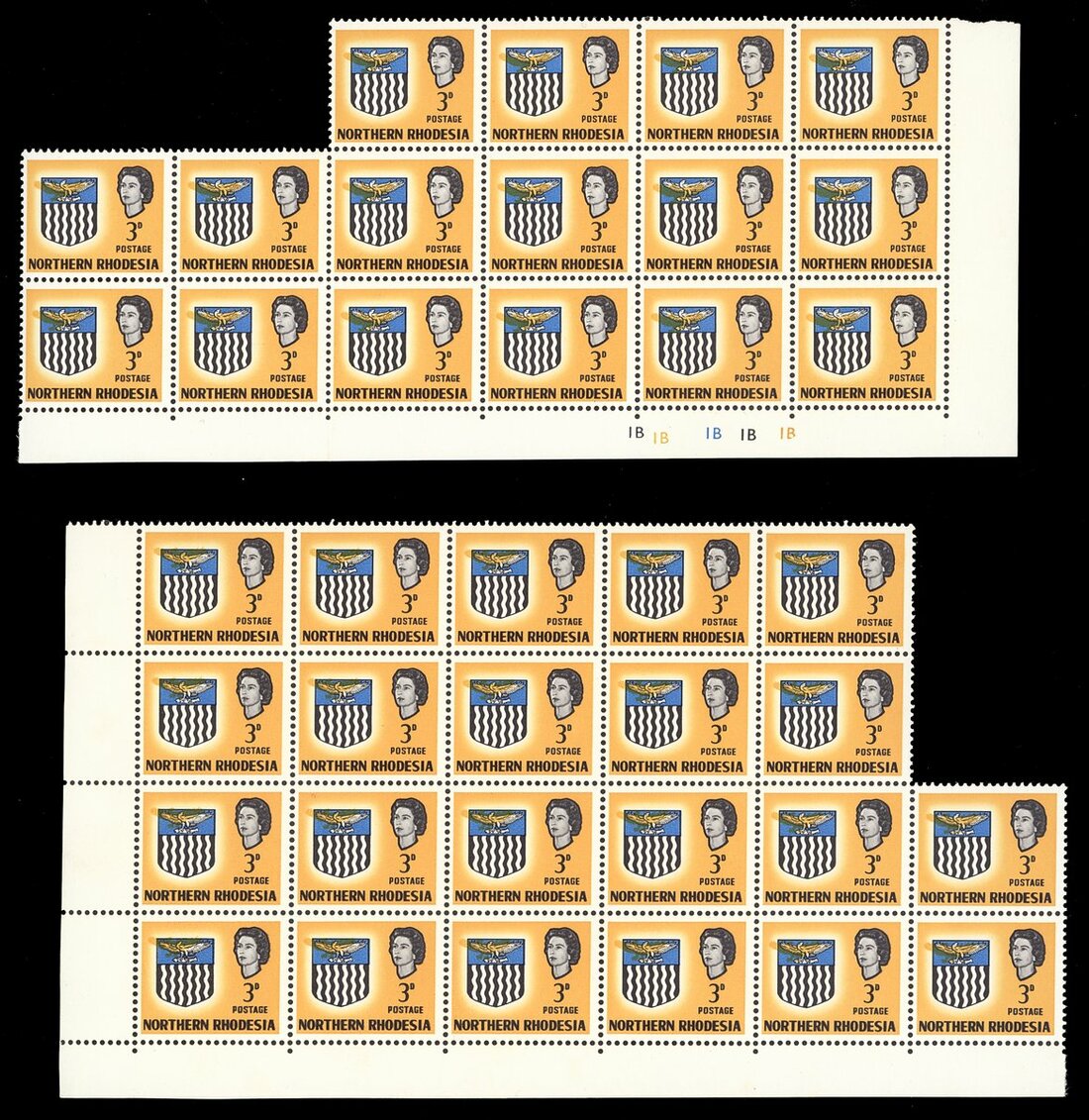 3d. Plate 1B lower right block of sixteen, variety orange (eagle) misplaced 2mm. downwards to left, and lower left corner block of seventeen, variety orange (eagle) misplaced 2mm. to left, fine unmounted mint. An attractive pair of multiples