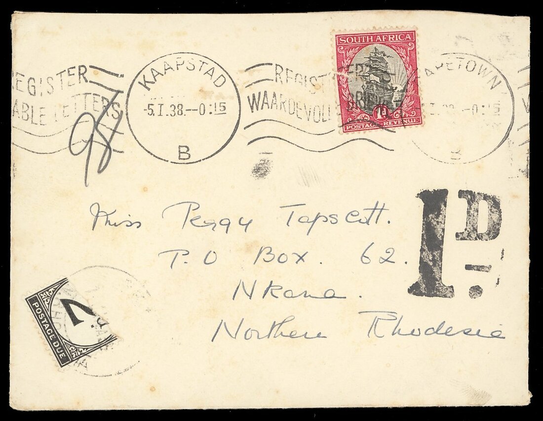 1938 envelope from Cape Town to Nkana underfranked with Ship 1d. (defective), upon arrival showing large h.s. "