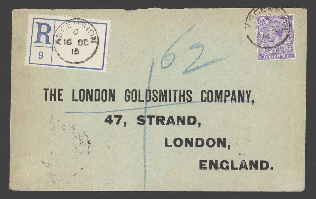 1912-22 3d. violet on 1915 (16 Oct.) envelope registered to England, cancelled by Ascension c.d.s. and showing registration label with, on reverse, straight-line "censored" and London d.s. (30.10.). A fine and scarce commercial usage. S.G. Z44