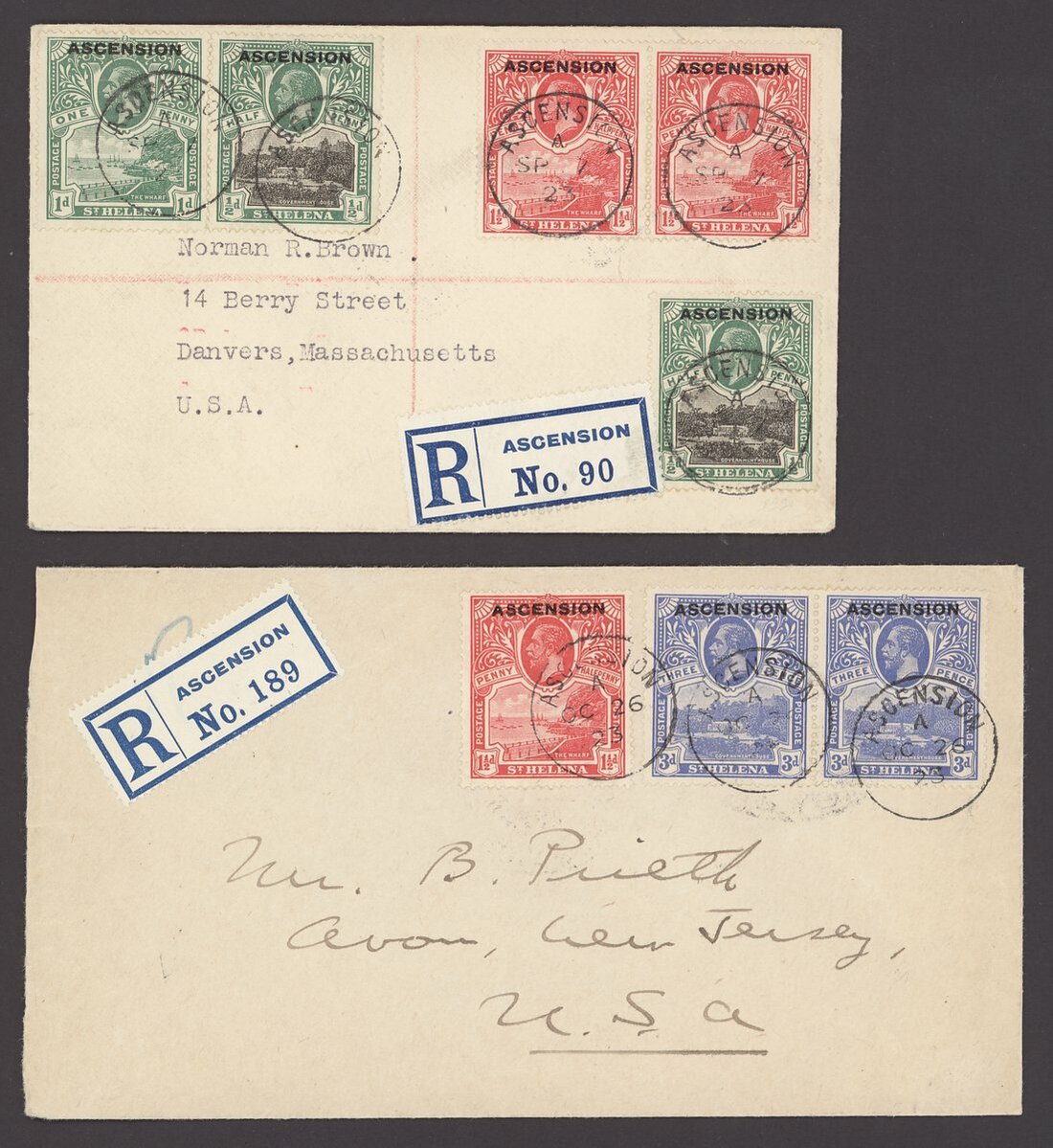 1922 envelopes registered to the USA (2), one bearing ½d.( 2), 1d. and 1½d pair, the other bearing 1½d and 3d pair; a fine and scarce duo