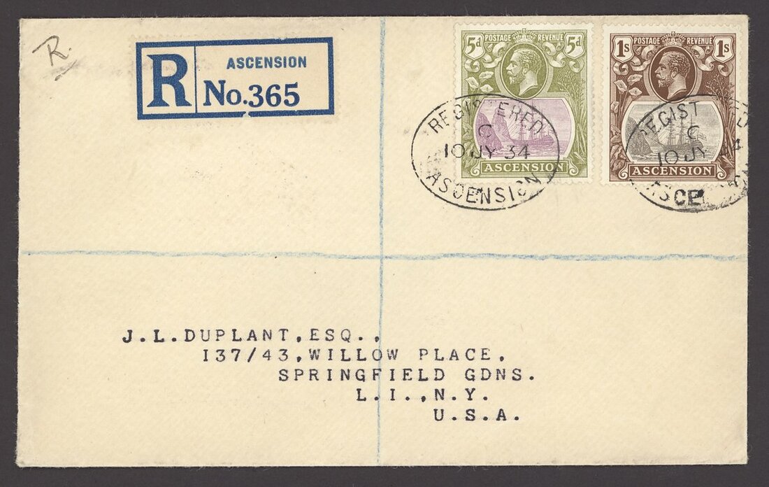 5d and 1/- neatly cancelled by Ascension Registered c.d.s. on 1934 (10 July) envelope registered to USA, fine. S.G. 15d, 18