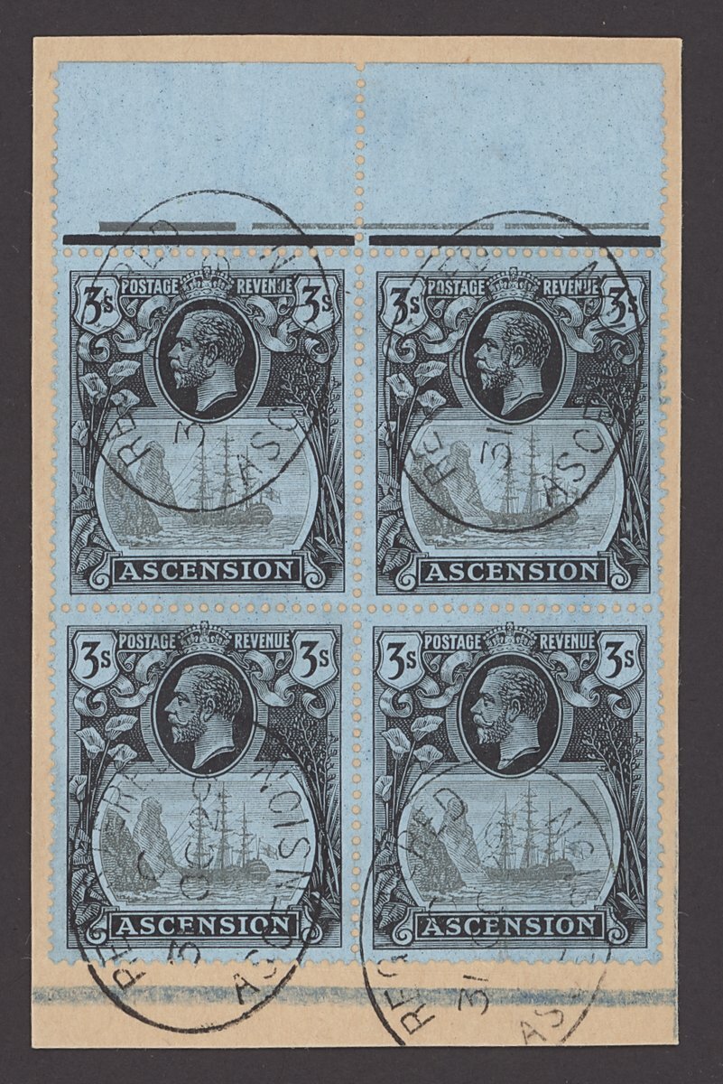 3/- grey-black and black on blue upper marginal block of four on small piece, neatly cancelled by Ascension Registered c.d.s. (31.10.29), very fine and scarce. S.G. 20, £400+