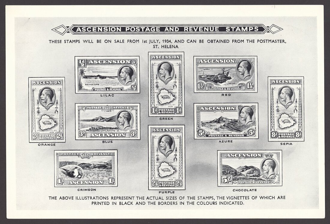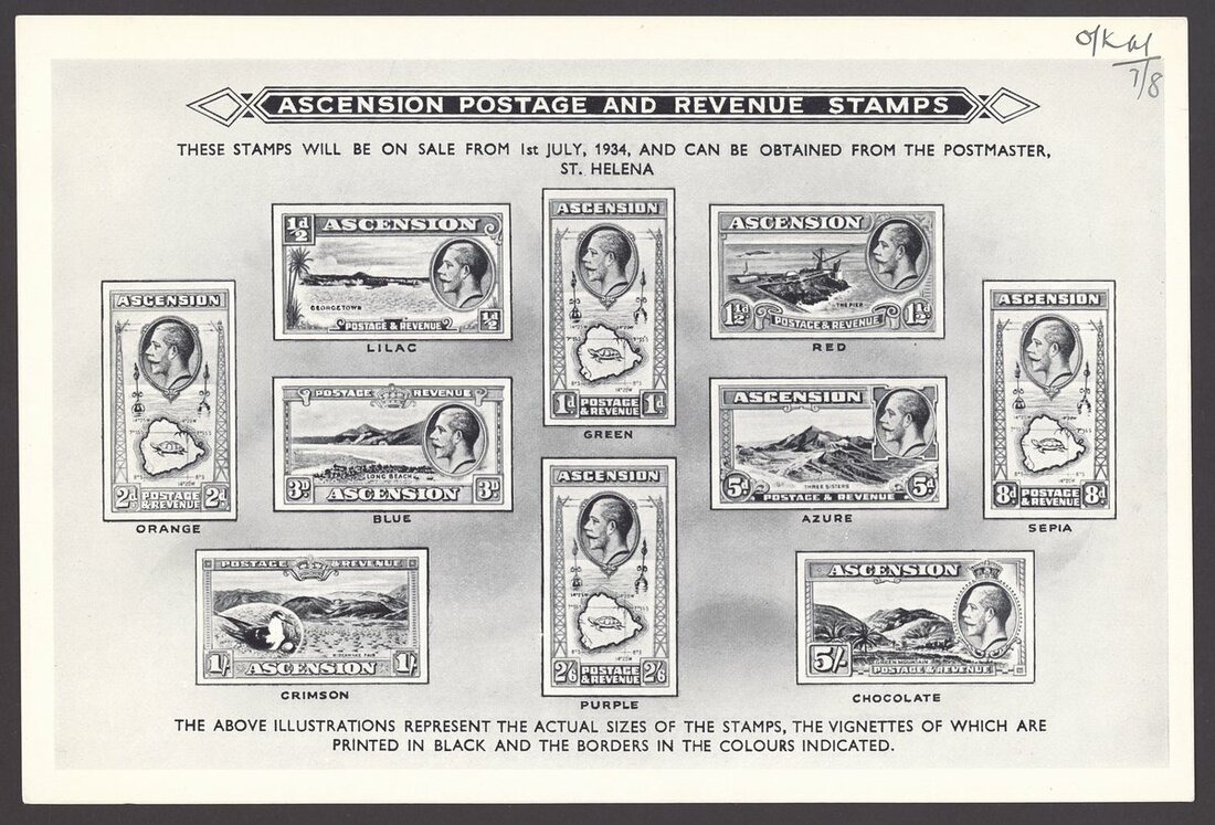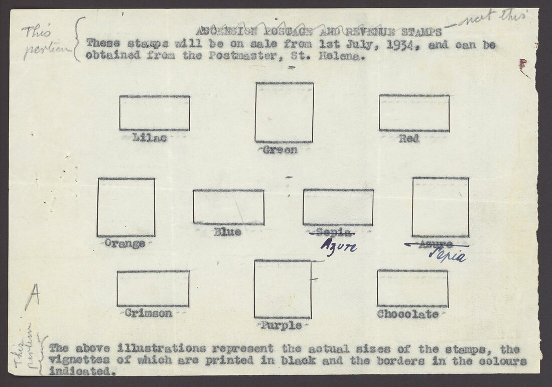 Artwork for the Post Office publicity handout, comprising a typed sheet (196x137mm.) with a layout of the wording and the positions for the stamps and their colours, a few amendments made in pencil including swopping the colours of the 5d. and 8d. values, and two examples of the printed sheet with the amendments now made, one marked "O/kay 7/8". The two adverts for the set have written