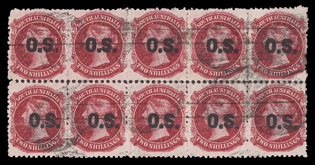 1881 watermark Broad Star, perf 10x11½-12½ 2/- carmine block of ten (5x2), fine used. Believed to be the largest used multiple. S.G. O21