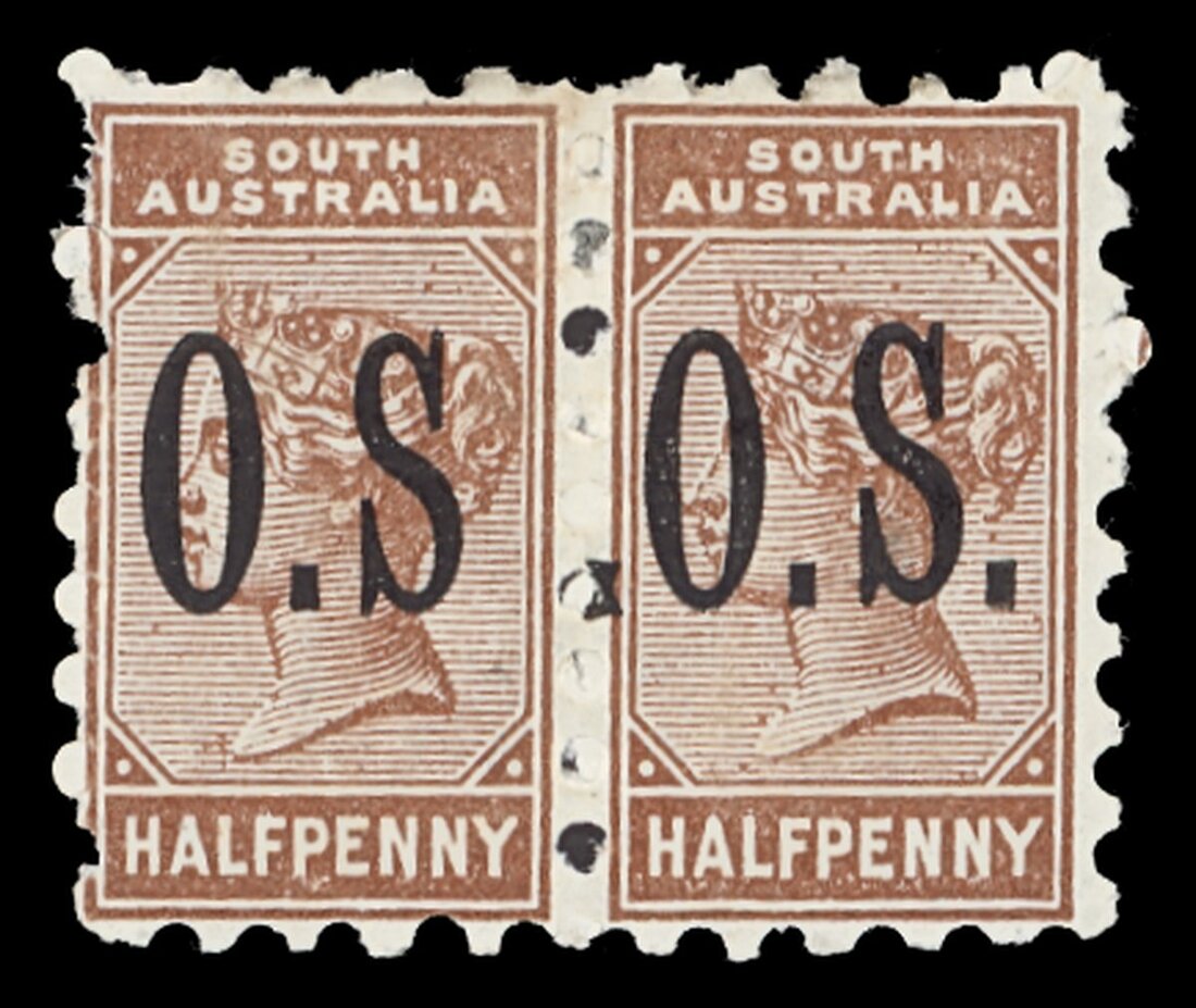 1891-99 perf 10 ½d. brown pair, the left stamp with variety no stop after "S", fine mint. S.G. O60b, £300 (much under-catalogued. Photo