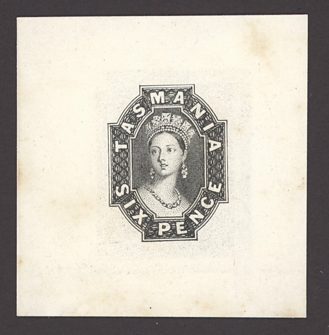 1858 6d. die proof in black on India paper backed on card (48x51mm.), minor tone towards top right; of the presumed original six examples struck two are cut down and this exceptional example is considered the finest. Photo
