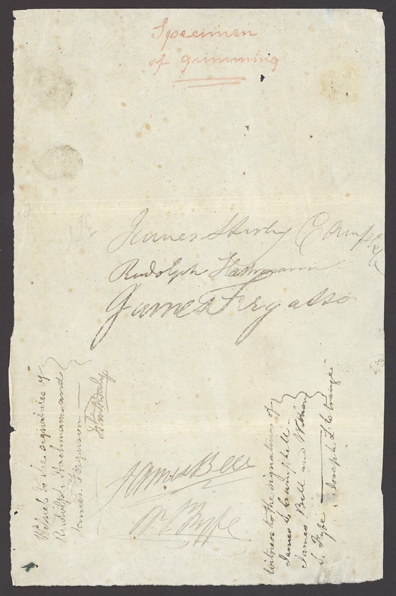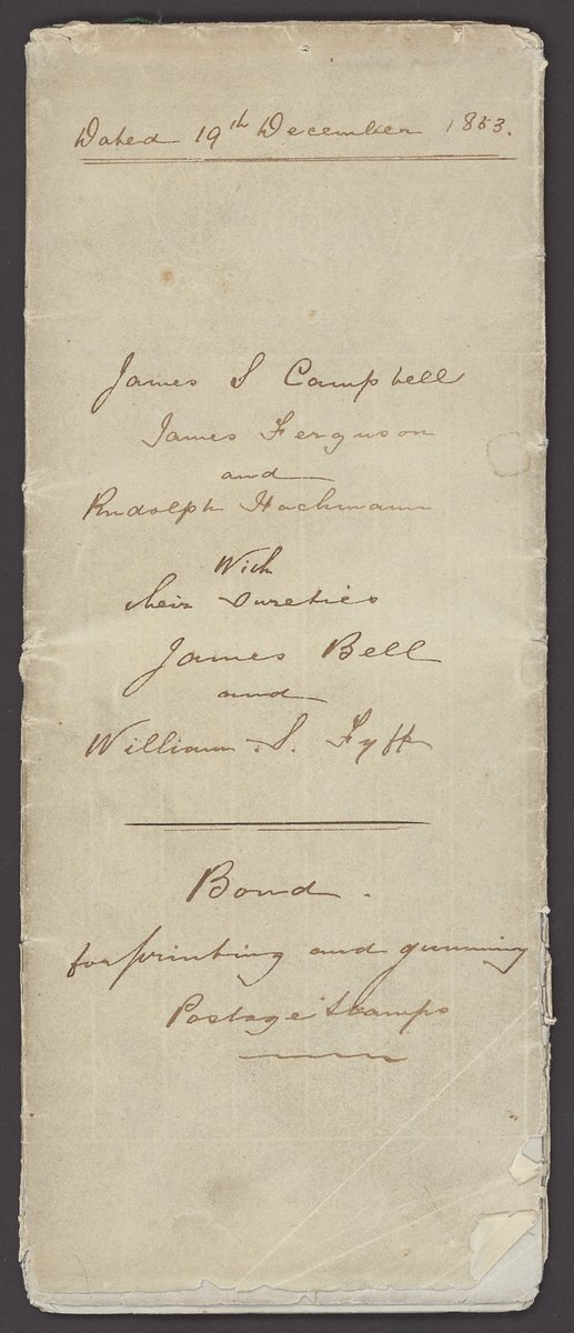 1854 original contract of J.S. Campbell & Co. for the printing of 500,000 each of the 1d. and 3d. Half-Lengths and 2,000,000 2d. Queen on Throne. Attached to the contract is the bond signed by James S. Campbell, James Fergusson and Rudolph Hackmann, and a specimen of the gummed paper to be used for printing the stamps signed by the same gentlemen. A highly important and unique document. Rod Perry Certificate of Opinion (2006). Photo