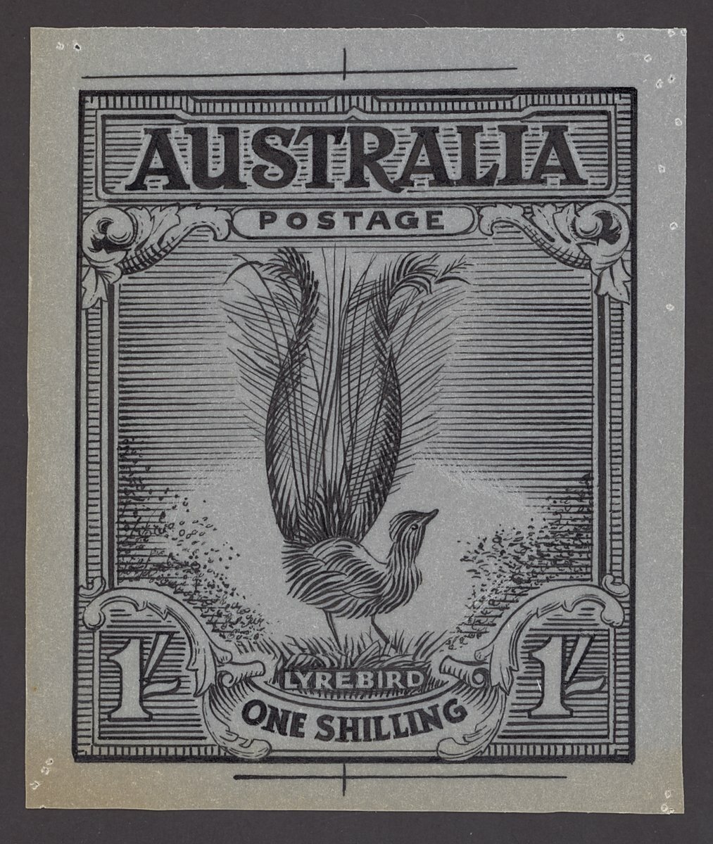 1932 1/- superb Lyrebird artist's hand-drawn impression in ink pen on tracing paper (83x100mm) with pin holes in each corner. Vey fine.