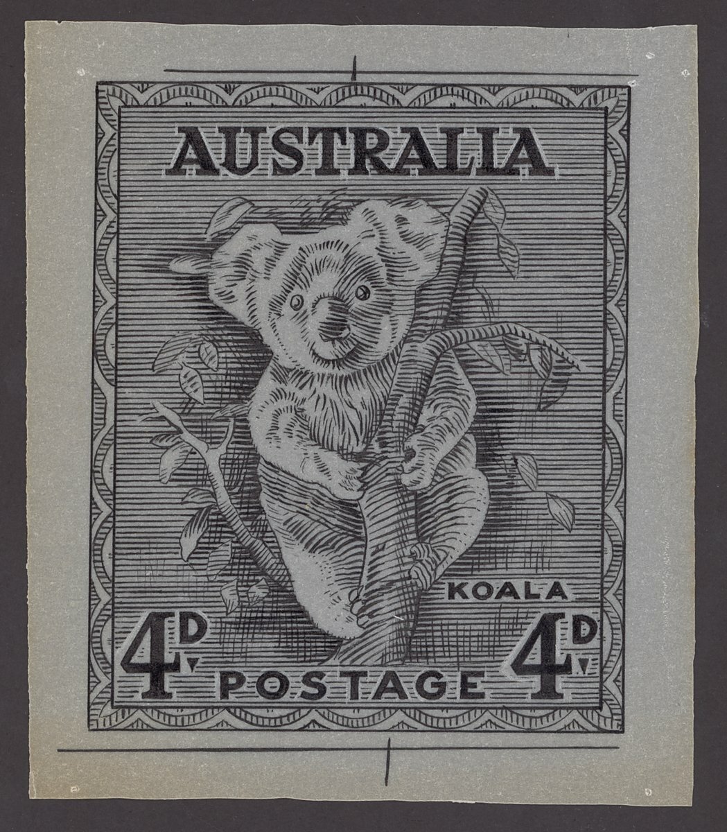 1937-49 4d. Koala artist's hand-drawn impression in ink on tracing paper (88x103mm) with pin holes in each corner. Very fine