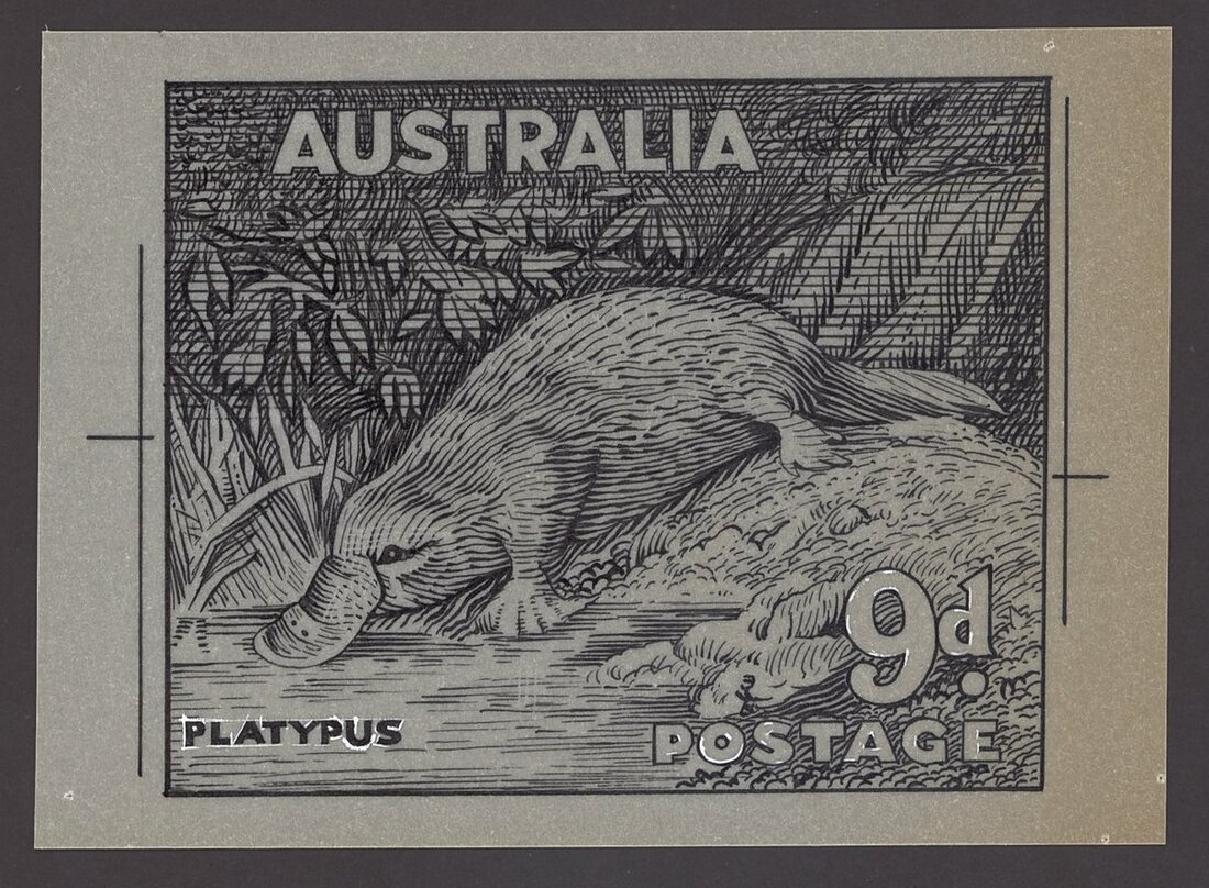 1937-39 9d. Platypus artist's hand-drawn impression in ink on tracing paper (110x80mm) with pin holes in each corner. Fine